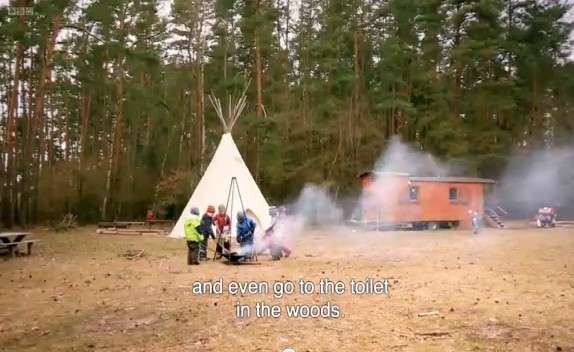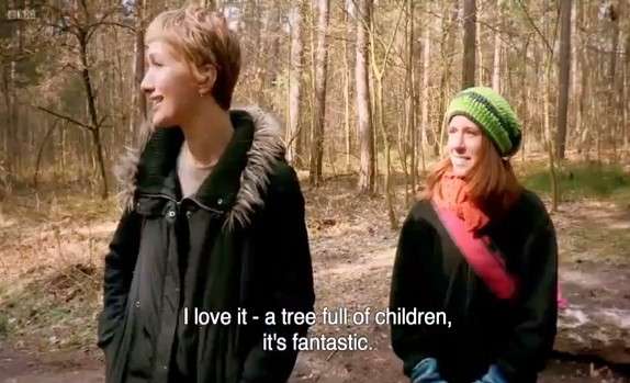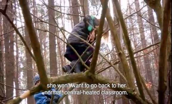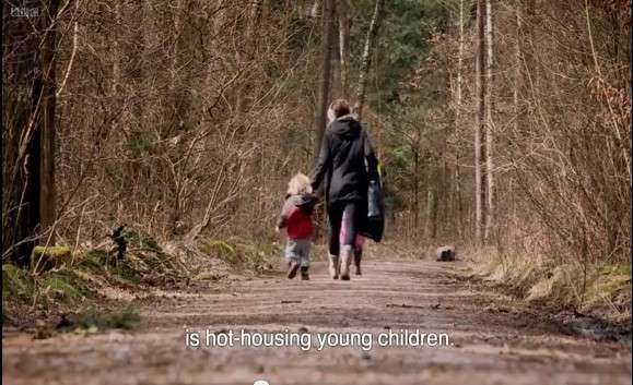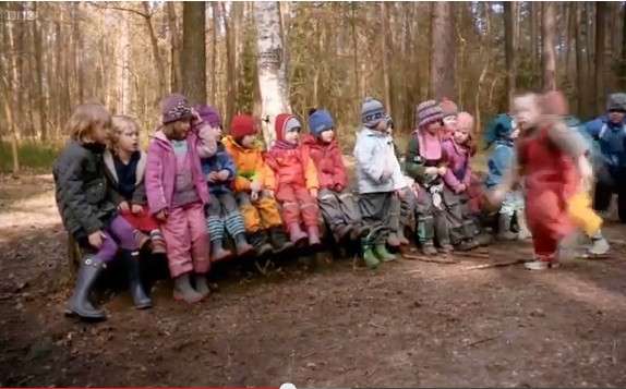 (如上图字幕:有一件事情和德国的成功没有关系,那就是对儿童的超前培养) 德国的小学(Primary School)和中国一样开始于6岁(而英国是4岁),六岁前的德国小盆友大多只有两种选择:和妈妈呆在一起或者去幼儿园。在德国的文化和认识里,母亲(这被视为职业)的位置很重要。对于只有父亲有收入的家庭(即母亲是家庭主妇)税收制度上有很多优惠,而同时育有儿女的话会有更大的补偿。所以,在孩子三岁以前,三分之二的德国家庭的女方会选择呆在家里。 因为在的国人眼中,这是极为重要的维系家庭稳定和子女健康成长的事情,当被人问“你是干啥的?”时候,“我是一个母亲。”是一句很自豪的回答。 那么,三岁以后的孩子有了行动能力,这时候就可以去幼儿园了。 纽伦堡地区的幼儿园是什么样子的?相信大家很熟悉了。什么,没看到图?上面那个带着耳罩的妈妈牵着卷毛娃娃就!!!!是!!!! 在!!!!幼!!!!儿!!!!园!!!!纽伦堡的森林幼儿园Forest kindergarten。。。 下面是老师介绍新来的英国小朋友时,童鞋们坐在教(sen)室(林)的凳(yuan)子(mu)上,请忽略那两个已经开始奔跑的熊孩子。。。 上课干些什么呢? 第一乐趣,烧火。。。看来德国人没有玩火会尿床的说法。 (字幕说他们不论刮风下雨都是在这块地方放养,上厕所就直接施肥就是了) 没有五颜六色的玩具,你看这位把自己当兰波在打扮的小姑娘。。。 (字幕:玩具在这里被禁止,孩子们玩着自己发明的游戏。。。不带拿炭灰涂脸这种吧?) 乐趣二, 爬树。。。