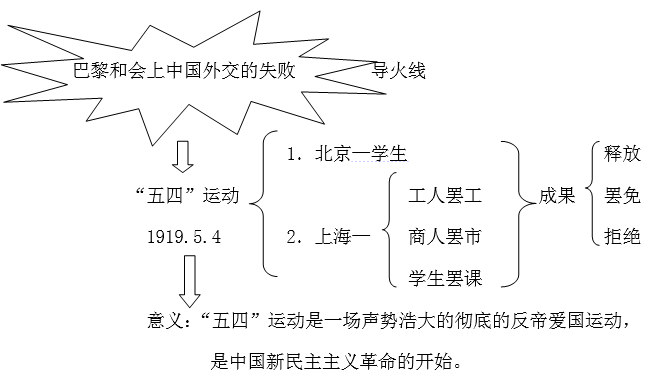 课堂小结 (5分钟) | 四、小结拓展提升 1.板书小结 2.五四运动以中国新民主主义革命的开端被篆刻在人民英雄纪念碑上了,为了弘扬五四精神 1949年12月,我国正式宣布五月四日为中国青年节。学习了这一课,你们认为什么是五四精神呢? | 师生共同板书小结;而后让学生通过学习“五四”运动,得出“五四”运动所传播的精神,激发学生的对“五四”精神学习 | 课堂的小结不采用简单的重复,而采用与学生共同板书的方式,最后用人民英雄纪念碑作首尾呼应,“五四”精神作为堂的升华 |