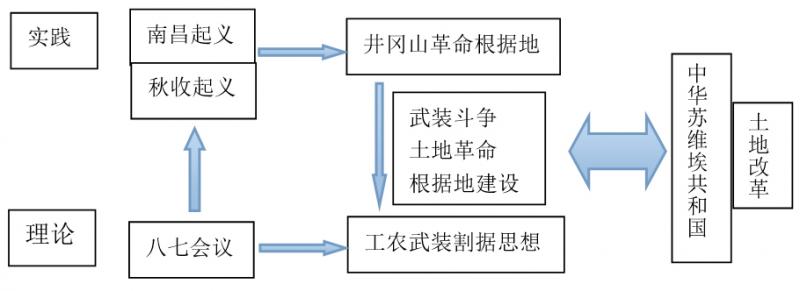 本节课分为三部分:第一部分讲南昌起义和“八七”会议,第二部分讲井冈山革命根据地,第三部分讲革命根据地的土地改革,知识点繁多,学生难以掌握,因此该教案围绕“工农武装割据”思想的形成进行设计,从蒋介石反革命政变导入,引发共产党人在实践上发动南昌起义和秋收起义,建立井冈山革命根据地、创建工农红军;在理论上共产党召开八七会议总结经验教训,确立“土地革命和武装起义的方针”、毛泽东提出“枪杆子里出政权”的重要论断,后来毛泽东进一步提出“工农武装割据”思想,教学时补充该思想的内容为武装斗争(主要斗争形式)、土地革命(基本内容)、根据地建设(战略基地)。在这一理论指导下根据地广泛开展土地革命,满足农民的利益和要求;建立中华苏维埃共和国临时中央政府,实行民主选举,根据地得到了壮大和发展。通过“实践—理论—实践”这一哲学原理,符合认识事物的规律,使学生能更好地理清学习思路,更清楚地把握本节课的知识结构,更有利于知识的记忆。 浙江省乐清市乐成一中 卢明周 谢龙清