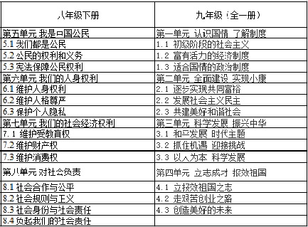 粤教版思想品德目录(上册:2014年7月版,下册:2014年12月版) 七年级 粤教版 | 八年级 粤教版 | 九年级 粤教版 | 上册: 第一单元 走进中学 1.1 我上中学了 1.2 认识新伙伴 1.3 融入新集体 第二单元 认识自我 2.1 悦纳自己 2.2 调控情绪 2.3 感受青春 第三单元 学会交往 3.1 我和父母 3.2 师生情谊 3.3 文明交往 第四单元 学会学习 4.1 培养正确学习观念 4.2 掌握科学学习方法 4.3 养成良好学习习惯 下册: 第五单元 人生多彩 5.1 珍爱生命 5.2 男生女生 5.3 友谊相伴 第六单元 自强不息 6.1 直面挫折 6.2 磨砺意志 6.3 自立自强 第七单元 法律护我 7.1 特殊保护 7.2 处处保护 7.3 自我保护 第八单元 法不可违 8.1 勿为小恶 8.2 严守法律 8.3 拒绝诱惑 | 上册: 第一单元 塑造自我 1.1 自尊自爱 1.2 明辨是非 1.3 自我负责 第二单元 善待他人 2.1 诚实守信 2.2 平等待人 2.3 与人为善 第三单元 相处有方 3.1 理解与宽容 3.2 欣赏与赞美 3.3 竞争与合作 第四单元 意义人生 4.1 关爱社会 4.2 胸怀世界 4.3 追求有意义的人生 下册: 第五单元 我是中国公民 5.1 我们都是猾民 5.2 公民的权利和义务 5.3 宪法保障公民权利 第六单元 我们的人身权利 6.1 维护人身自由和生命健康 6.2 维护人格尊严 6.3 保护个人隐私 第七单元 我们的文化经济权利 7.1 维护受教育权 7.2 维护财产权 7.3 维护消费者权 第八单元 我们的社会责任 8.1 社会合作与公平 8.2 社会规则与正义 8.3 社会身份与社会责任 8.4 负起我们的社会责任 | 第一单元 认识国情 了解制度 1.1 初级阶段的社会主义 1.2 富有活力的经济制度 1.3 适合国情的政治制度 第二单元 共同富裕 社会和谐 2.1 走共同富裕道路 2.2 发展社会主义民主 2.3 共建美好和谐社会 第三单元 科学发展 国强民安 3.1 以人为本 科学发展 3.2 可持续发展 生态文明 3.3 和平发展 时代主题 第四单元 情系中华 放眼未来 4.1 中华文化 传承创新 4.2 民族精神 发扬光大 4.3 迎接挑战 立志成才 |