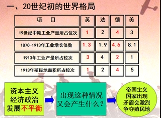 第一单元第一课第一次世界大战 全部课时 这节课主要是简述第一次世界大战爆发的历史背景;分析人类历史为什么发展到20世纪才会出现世界大战;简述第一次世界大战的过程(以时间为序);简述德奥集团失败的原因。简述第一次世界大战的后果和对人类历史发展的影响 教学重难点 1、20世纪初的世界格局; 2、第一次世界大战; 3、凡尔赛-华盛顿体系; |