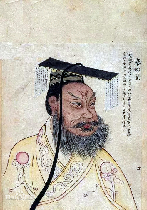 秦始皇认为自己的功劳胜过之前的三皇五帝,采用三皇之“皇”、五帝之“帝”构成“皇帝”的称号,是中国历史上第一个使用“皇帝”称号的君主,所以自称“始皇帝”。同时在中央实行三公九卿,管理国家大事。地方上废除分封制,代以郡县制,同时书同文,车同轨,统一度量衡。对外北击匈奴,南征百越,修筑万里长城,修筑灵渠,沟通水系。但是到了后期,求仙梦想长生,苛政虐民,动摇了秦朝统治的根基,前210年,秦始皇东巡途中驾崩于沙丘。