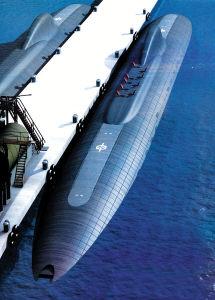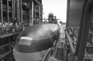 ■ 船台上的“亚森”级核潜艇(上)和“亚森”级核潜艇的模型(下)