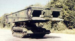 “比奥尼克斯”(Bionix)抢救车是在新加坡“比奥尼克斯”步兵战车底盘的基础上制造的,不过车体为全新的全焊接钢结构。为了提高战场生存能力,车体加装了附加装甲。车后部安装了一个液压操纵的起重机以及可伸缩起重臂,最大起重量30吨,起重臂可伸长6.5米,此外,起重机可从车内操纵,也可在车外通过遥控装置操纵。当该车处于最大限度工作状态时,车前、后部的稳定器将放下。液压操纵的绞盘最大拉力25吨,不过可以增加到50吨,钢缆长度为90米。绞盘通常安装在车后部,当在拖较重的车辆时,车后的稳定器通常被打开。武器有2挺7.62毫米并列机枪和2排电动操纵的76毫米烟幕弹发射器。乘员3人,战斗全重24吨,最大速度70千米/小时,最大行程415千米。 装甲架桥车 “一桥飞架南北,天堑变通途”,这句诗很形象地表现了桥梁的作用和意义。遇山开路,过河架桥,这可谓工程兵的天职。但在战场中,两军对垒,开路架桥就得冒极大的风险,而且在时间上要求尽可能地快。于是装甲架桥车就成了工程兵的得力助手,它一般带有完备的架桥工具,甚至背着一座桥行军,只需在指定的时间指定的地点放下就行了。下面介绍的几种架桥车都是世界上同类车辆中性能优异的佼佼者。 PTA模块式突击架桥车 2003年9月,法国政府装备采购局与CNIM公司签署了一份价值1.38亿欧元的合同,定购18辆PTA模块式突击架桥车。该车采用l0×10越野底盘,安装了动力转向装置、独立式悬挂以及中央轮胎充放气系统。标准的PTA-2模块式突击架桥车携带两个桥体,它们上下叠放,从车前部架设。桥体长度依水面宽度而定。l辆PTA-2模块式突击架桥车可架设2个跨度14.3米的桥,也可架设跨度26米的桥。PTA模块式突击架桥车使用的所有桥体都可在车内乘员处于核生化的完全防护以及装甲防护下进行铺设和收回。另外,PTA还可以架设1个跨度27米的MLC桥,由3个10米长的桥体构成。乘员2人,战斗全重5.1吨,最大速度70千米/小时,最大行程900千米。 “大力神”架桥车