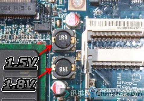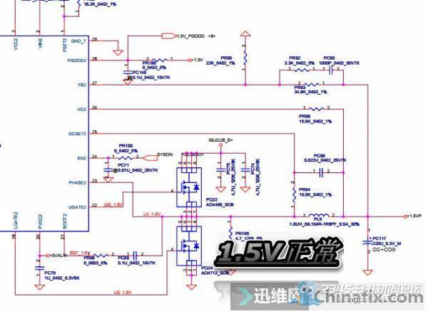 接上可调电源,检测主板上3V、5V电路的电感上已经输出正常电压,测开关上也有3.3V.按下开关,电流到0.3A左右,看来有可能是CPU的供电电路工作不正常。测3V、5V后继电压输出正常,1.8V,1.5V输出正常。见下图: