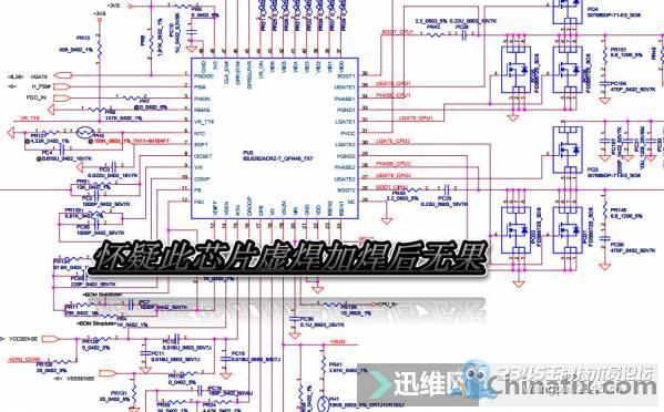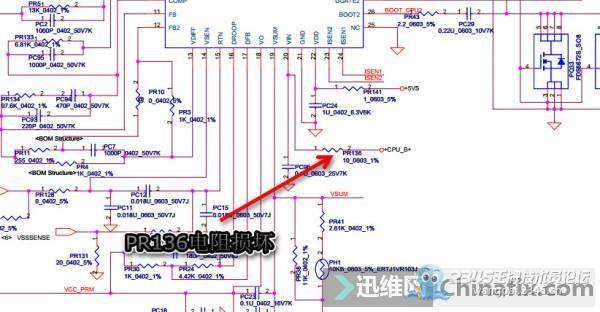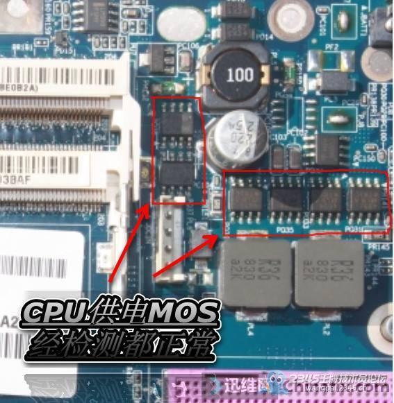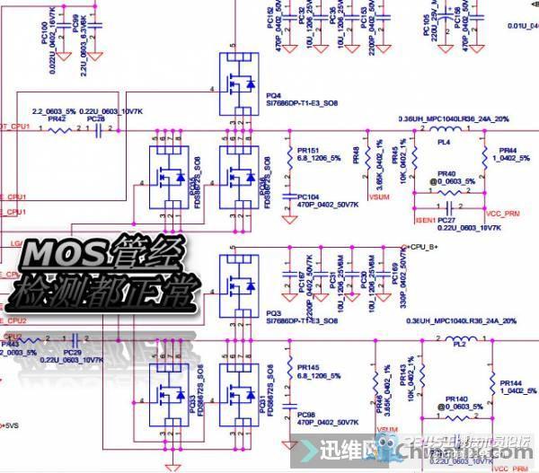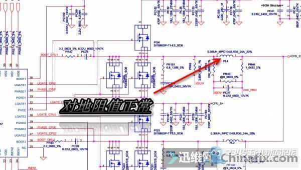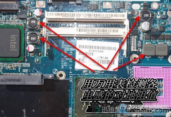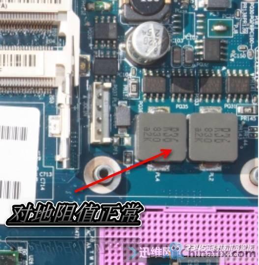 拆机取出笔记本电脑主板,目测没见异常。用万用表测主板上关键测试点公共点,分组供电各路电感,CPU供电感对地阻值正常。见下图: