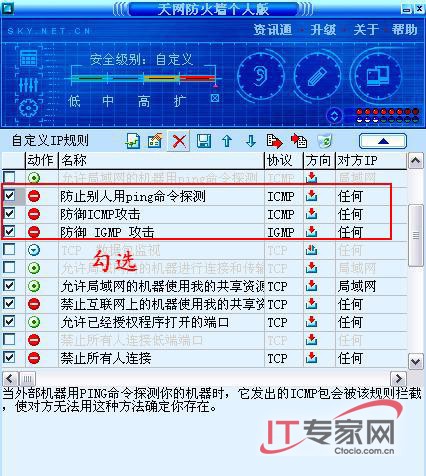 2、防篇 在抵挡PING洪水攻击,建议安装网络防火墙(如天网),在设置里面选择“不允许别人用Ping命令探测本机”。(图4)
