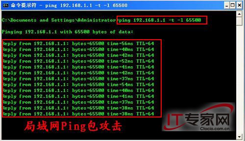 (3).查看历史连接记录:也许在你外出的时候会有人使用你计算机中的资源那么怎样才能知道呢?通过这个标签就可以查看所有连接的详细记录情况。除去和当前共享连接一样拥有其他用户调用的文件资源、连接时间、IP地址和用户名信息之外,更增加了断开连接时间和连接总时间,这样能够更加完整地了解到别人对你计算机资源的使用情况。除了对局域网的防护外,Lockdown对常见木马的查杀也为那些疏于防范的用户加了一把锁。 二、抵挡Ping洪水攻击 1、黑篇 WINDOWS 提供一个PING程序,使用它可以测试网络是否连接,Ping洪水攻击也称为ICMP入侵,它是利用Windows系统的漏洞来入侵的。在工作中的命令行状态运行如下命令: “ping 192.168.1.1 -t -l 65500”,192.168.1.1是局域网服务器的IP地址(如图3),这样就会不断地向服务发送大量的数据请求,如果局域网内的计算机很多,且同时都运行了命令:“ping 192.168.1.1 -t -l 65500”,想一想有什么结果呢?服务器将会因CPU使用率居高不下而崩溃,这种攻击方式也称DoS攻击(拒绝服务攻击),即在一个时段内连续向服务器发出大量请求,服务器来不及回应而死机。 (图3)