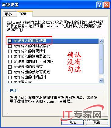 当然也可在“管理工具”中打开“本地安全策略”,进入“IP安全策略”进行IP安全配置。系统防火墙也可以防御ping攻击,在防火墙的“高级设置”的“ICMP”选项卡下确认没有勾选“允许传入的回显请求”(图5)