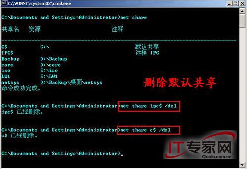 其次客户端也可以使用默认共享方式入侵服务器:在该客户机的网络邻居地址栏中输入serveradmin$,便可进入服务器的系统目录,此时该用户可以删除件。若再输入serverd$,即可进入服务器上的D盘,此时该客户机用户已经具备服务器的管理员权限,这是相当危险的。居心叵测的人可以通过上传脚本或者木马创建管理员用户或者通过木马来控制服务器,其后果不堪设想。 2、防篇 Win2000/XP采用默认共享方式来方便远程维护,但同时也给了有心者可乘之机。怎么办?可能通过修改注册表来关闭默认共享,打开注册表编辑器,依次打开HKEY_L0CAl_MACHINESYSTEMCurrentControlSetServiceslanmanserver,若系统为Win2000 Pro,则新建Autosharewks的DWORD值,并设键值为0;若系统为Win2000 Server,则新建Autoshareserver的DWORD值,并设键值为0。重新启动计算机后就关闭了默认共享。 管理员怎么禁止IPS$空连接呢?在注册表编辑器找到子键HKEY_LOCAL_MACHINESYSTEMCurrentControlSetControlLSA,修改Restrict Anony-mous的DWORD值为0000001。或者是运行命令:net share ipc$ /delete (图7)