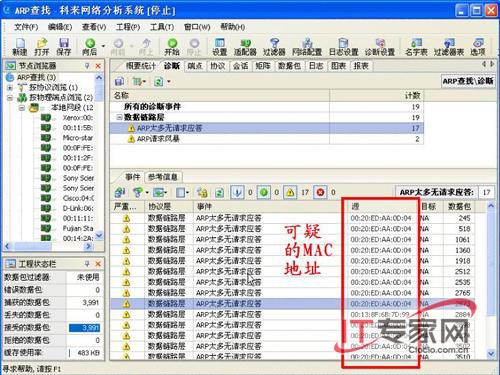 四、ARP欺骗 1、黑篇 ARP欺骗仅存在于局域网中,因为局域网是依赖MAC地址作为源地址、目的地址来传输数据帧的。在局域网传输数据过程中需要将IP地址转为对应的MAC地址用于数据帧传输,如果找不到请求的目标IP对应的MAC地址,则广播ARP request包请求解析该IP对应的MAC地址。恶意攻击者而在局域网中任意构造一个ARP包或者传播ARP病毒,这样导致局域网ARP欺骗。使得局域网地址解析故障,造成网络瘫痪。 实际网络中存在多样的欺骗方式,但都是通过广播精心构造的ARP包来修改PC端ARP缓存中的IP-MAC对应关系,只是选择了修改“源IP地址、源MAC地址、目的IP地址、目的MAC地址”其中某项实现欺骗目的。 2、防篇 (1).PC端:如果是windows系统在cmd模式下,执行arp-a,显示当前系统ARP缓存表,检查缓存中的IP-MAC对应关系是否正确,正常情况下IP-MAC是一一对应的。另外可先使用arp-d清除当前ARP缓存表,再开始观察是否存在ARP欺骗的情况。 (2).网络设备端:通过show arp命令检测ARP缓存信息。如果某MAC地址对应多个IP地址,则说明该MAC地址的PC正在广播ARP欺骗包(如果某设备存在多IP地址,这种情况是正常的)。另一种恶意欺骗是该MAC地址域网中根本就不存在。 (3).还有个比较简单的方法,装个sniffer监听网络中所有ARP包,由于ARP欺骗往往使用广播形式传播,即使在交换机环境下也明显能监听到某PC端正在狂发ARP包。下图是笔者用“科来网络分析系统”检测并定位到ARP毒源主机。(图8)