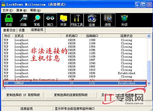 (3).其他功能:另外攻击者可以通过该工具轻易地复制或者上传文件,如果被植入木马病毒那服务器或者客户端就被完全控制了。如果服务器或者客户端的密码不够强大,那么就可以很容易地通过该工具进行远程控制。 2、防篇 对于基于工具的攻击我们同样运用工具来预防,笔者以Lockdown来演示。Lockdown的功能比较强大,如果在局域网上有其他计算机连接到你的电脑上时,Lockdown会自动把对方和你之间的连接过程记录下来,使得对方的连接完全在你的监视之下。此时你不仅能够记录到对方的IP地址,还可以把对方主机的名称也一并记录下来。这样,即便被人非法入侵也可以根据记录顺藤摸瓜,拉出幕后黑手。另外,Lockdown还可以对有关局域网共享连接进行设定,而且可以监测所有连接到计算机用户的使用情况。 (1).共享文件管理及设置:在局域网中可能有人会趁你不在的时候把一个很隐蔽的文件夹设置为共享,然后在通过这种方式侵入你的计算机,而一般情况下你是很难发现这些共享的文件夹,所以Lockdown就在这里显示了当前计算机所有共享的文件夹名称。仔细查看一下,如果其中有些文件夹并不是经你同意共享的,那就果断的将这个隐患关闭。 (2).查看当前连接:Windows中一般无法查看出到底有哪些连接到你的计算机中,而在Lockdown的这个标签下就显示了当前所有连接到计算机上的用户,以及他们所进行的操作,比如进入了哪些文件夹,运行了哪些程序文件等等。同时,在窗口右边还提供了计算机建立连接的时间,IP地址、用户名等有用的信息,通过这个窗口能够很快了解到哪些非法用户登陆到你的计算机。 (图2)