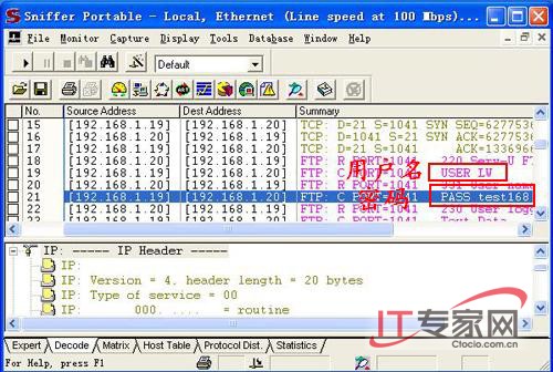 (5).反欺骗,通过命令设置一个错误的网关地址,反欺骗ARP病毒,如图10。然后再添加一条静态路由,设置正确的网关如图11,用来正常的网络访问,并且比那条用来欺骗ARP病毒的那条路由的权限要高。(图10)(图11) 五、嗅探 1、黑篇 局域网是监听嗅探的温床,这是由嗅探的原理决定的。攻击者在局域网内的一台主机、网关上放入监听程序,从而可以监听出网络的状态、数据流动情况以及传输数据的信息。因为在通常条件下,用户的所有信息,包括帐号和密码都是以明文的方式在网络上传输的。在局域网中进行嗅探技术门槛比较底,而且类似sniffer这样的嗅探工具非常多,几乎是傻瓜式的操作,因此,只要具有初步的TCP/IP知识的人利用嗅探程序获取用户的各种信息并不是一件很困难的事,危害极大。如下图是笔者在局域网中用sniffer嗅探到的某用户登陆FTP服务器时的用户名和密码。(图12)