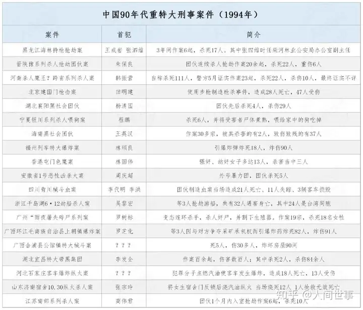 人间网:犯罪行为,特别是重大刑事犯罪行为,是集中反应阶段性社会问题与矛盾的一面镜子。 20世纪90年代,是国内外形势剧烈变化的十年。国际上,苏东剧变,两极格局瓦解,世界格局从旧的“两极争霸”转向以美国一个超级大国,多个强国并列的“一超多强”新局面,世界政治、经济格局迅速变化。97、98年的亚洲金融危机,更为新旧世纪交界的国内外经济形势增强了不确定性。 中国国内,香港、澳门陆续回归,九八洪水更是成为一代人难以磨灭的刻骨记忆,改革开放进程触及到深水区。国企改制,国有单位职工大批量集中下岗,同时又一轮的下海经商风潮席卷全国。沿海地区,特别是沿海大城市私营工厂开始全面崛起,外出务工人口迅猛增长,中国城镇化进程进入快车道。 我们发现,20世纪的最后十年,无论是国际还是国内,无论是政治还是经济,都处在剧烈变化的之中。充斥在社会上的不确定因素众多,社会治安情况急转直下,一系列在今天看来足可谓是惊世骇俗、惨绝人寰的大案要案频发。这些案件,为我们回顾与反思那个时代,留下了重要的资料。 这一期,是1994年大案要案。 黑龙江海林持枪抢劫案(王成岩 张泗维) 1994年,震惊我省的公安民警直接参与杀死17人的“4·22”特大案件经历了长达两年多的时间得以破获。犯罪嫌疑人张泗维为了金钱,不惜铤而走险,先后杀害了3名民警和14名群众。 1994年1月30日10时30分,省公安厅指挥中心向海林及柴河警方通报了柴河籍犯罪嫌疑人王成岩因在辽宁省开源市持枪抢劫杀人被击毙,当地警方缴获的两支“六四”式手枪”,正是“4·22”和“10·6”案件中被抢走的那2支手枪。经查,犯罪嫌疑人王成岩,42岁,原柴河贮木加工厂工人,1990年因犯涉嫌强*奸被开除公职。 张泗维在其人生的旅途上,也曾留下闪光的足迹。1981年,他调入公安局当通讯员,由于工作积极肯干,好学上进,1982年8月调入柴河派出所当内勤民警,因其勤奋,记忆力好,熟悉人口,百问不倒,而荣立三等功;1984年9月他又考上省警校,1986年9月警校毕业后,到公安局预审科当科员;1990年4月到办公室当秘书;1992年提升为副主任,而后入党。据张泗维交代,早在上警校,他就深切地感到,钱不是万能的,但是没有钱却是万万不能的。崇拜金钱是张泗维走向犯罪的一个主要原因,作为警察生活是比较清贫的,随着改革开放,市场经济的发展,他看到越来越多的人富了起来,令他垂涎三尺,他开始钱迷心窍,心理失去了平衡,但过低的工资让他无法过上富裕奢侈的生活。 王成岩是一个被公安机关多次处理过的人。1990年张泗维在办理王成岩强*奸案时与其勾结在一起,对金钱的崇拜使二人臭味相投。从那时起,他俩为了满足金钱的欲望,开始计划如何弄大钱。偷!弄不到太多的钱,不值得。要抢钱,抢富裕户或银行的钱,抢钱最好的武器就是枪,所以才有“4·22”案件的发生。 晋陕豫系列杀人抢劫团伙案(朱保良) 犯罪分子朱保良(男,24岁,河南省滑县人,无业)、何晓磊(男,28岁,山东省平邑县人,无业)与白学峰(男,23岁, 河南省浪阳市人,无业)于1993年 1月2日至1994年1月28日期间, 携带“独角龙”手枪、匕首、杀猪刀、 菜刀等凶器,流窜至河南省新乡、新邪、尉氏、洛阳、宝丰、登封、辉县, 山西省长子、长治、陕西省华阴、华 县、洋县等3省12个县、市故愈杀 人、抢劫、强j作案19起,共杀死 17人,致伤6人。 河南杀人魔王跨省系列杀人案(韩振营) 韩振营,河南跨省系列杀人抢夺案主犯。其8年间流窜14地市杀人抢劫作案,经警方查证,其作案23起,杀死27人,杀伤10人,但他坚称杀死63人。 1996年12月27日,湖南省常德市中级人民法院判处韩振营死刑,剥夺政治权利终身。韩振营,1974年出生于河南省镇平县彭营乡。1988年6月因打架被行政拘留15天,1990年元月19日被依法逮捕,同年9月18日因盗窃罪被南阳市人民法院判处有期判刑9年,投入河南省新郑监狱服刑。 1992年4月减刑一年,1993年10月减刑一年,1995年元月16日由郑州市中级人民法院裁定假释,25日出狱。1995年6月19日因抢劫、盗窃被某市公安局刑事拘留,押在某看守所,27日被依法逮捕,同年9月22日因病在某市中心医院就诊,次日凌晨5时许脱逃。 1995年3月上旬,韩振营窜到湖北省武当山东侧太山庙旅游区,将景区一位30岁左右男摄影师打下悬崖致死,韩从死者身上抢走金戒指、照相机及若干钱财后,逃离现场。 1995年3月26日,韩振营窜至河南省邓州市,将西城区金鸡泉一号楼的31岁韩某杀害,抢走1000多元人民币后逃离;6月上旬某夜,韩振营窜至河南省方城县,将粮食局大院一68岁老太太杀害,抢劫数万元后逃离现场。 1995年10月至1996年3月,沿河南、湖北、湖南、浙江一线,连接不断发生以抢劫财物为目的的凶杀案,一幕幕鲜血淋淋的人问惨剧摆在公安干警的面前: 1995年10月13日,湖北襄樊市路灯管理处技术员黄永杰被半夜人室的歹徒用铁锤砸死;11月26日,浙江杭州市灵隐风景区,温州游客应凌聪被人用皮带勒死; 12月22日,浙江杭州市灵隐风景区,福建游客柯顺容被人用背包带勒死;30日,湖北荆沙市医药局守夜人王学汉被半夜人室的歹徒用铁锤砸死;31日,湖南醴陵市一位68岁的老妇被半夜入室的歹徒用铁锤砸死,其孙女被砸成重伤; 1996年1月2日,湖南株州市淞南市场二位值班老人半夜被歹徒用铁锤砸死;8日,湖南常德市常崇酒楼保安人员张桃菊半夜被行窃人用铁锤砸死;同日,湖南张家界市五交化公司职