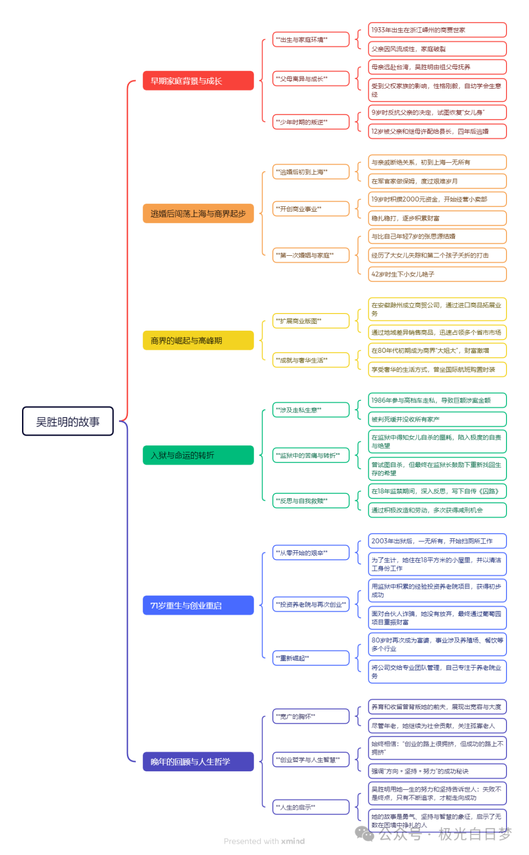 她,从中国女首富到53岁死缓,71岁出狱,92岁再成富婆 | 吴胜明奶奶 前几天,我在中国创业女性创力峰会的现场,见到了92岁高龄的吴胜明奶奶。 92岁的吴奶奶,谈到自己的作息,依然可以每天工作十个小时,早上7点左右起床,写脚本、拍视频,晚上做直播,11点休息。我第一次知道,年龄真的只是一个数字,92岁的人,也可以这么强。她被称为女版“褚时健”:丈夫出轨,女儿自杀,中国前女首富,53岁被判死刑,努力18年成功减刑,71岁出狱,从清洁工到再创业,76岁,东山再起,身价千万,92岁还在努力创业,拥抱互联网。短短一段话,却是字字惊心。 插播:吴胜明 她,从富家女逃婚到中国女首富 吴胜明1933年出生在浙江嵊州的一个商贾世家。母亲受不了父亲风流成性改嫁台湾,父权家族的背景下,她被当作假小子养大。 9岁时,她为了恢复女儿身,绝食反抗。 12岁时,她被父亲和继母许配给了当地的县长当童养媳,四年后逃婚。 吴胜明逃到上海,只能在一个军官家中当保姆,一当就是两年。 18岁那年,她到西安投奔军官叔叔,遇到叔叔部队的军医初恋于萍。但由于叔叔的干预,他们的爱情并没有结果。 这是于萍写给她的三句话: 碌碌奔波为人谋,长江一去无回浪,但看河水向西流。 这三句话,吴胜明记了一辈子。 30年后,他们曾在一间软卧车厢相遇。但碍于两人都已结婚生子,并未相认。 19岁那年,她从经营小卖部开始,一步一步稳扎稳打,生意做得越来越红火。 近三十岁的吴胜明与小七岁的张思源步入婚姻殿堂。遗憾的是大女儿丢失,第二个孩子夭折,42岁才拼命生下小女儿艳子。 到了80年代初,吴胜明已经是商界的风云人物,她通过利用地域差别,将广东的商品卖到河南、四川等地,成功将商业版图扩展到多个省市,成为上海商界的“大姐大”,有钱的时候,她甚至会为了买一件新衣服,坐国际航班去国外采买。 她,53岁入狱,积极表现,获得9次减刑机会 最难控制的,往往是人的欲望。 1986年,吴胜明被诱导进入高档车走私生意。那时候的她,从未意识到,这将彻底改变她的一生。 《追寻生命的意义》一书的作者,弗兰克说:有一样东西你是不能从人的手中夺去的,那就是宝贵的自由。 1986年,因涉案金额巨大,吴胜明被判处死缓,并没收了全部家产。 在监狱中,她原本想通过积极表现争取减刑,早日与家人团聚。 却不料,丈夫出轨保姆,与保姆私奔,对女儿不管不问,将女儿丢在大伯父家,而她的女儿在得知母亲是无期、出狱无望后,向父亲写信,想与父亲一起生活,遭父亲拒绝后,认为人生无望,选择了自杀。 这对被隐瞒了2年后才知道的吴胜明来说,是她人生至暗时刻。 她曾一度绝望,甚至想放弃生命。但监狱长对她说:“为了女儿的遗愿,你一定要活下去。” 正是这句话支撑着她度过了最黑暗的日子,在监狱里,吴胜明认真改造,积极劳动,最终因表现优异获得九次减刑机会。2003年,吴胜明以71岁高龄重新走出监狱。 她说:“当我走出监狱的那天,我感受到了阳光的可贵。” 她,逆境中重生,71岁出狱后,清洁工重新起步 2003年,71岁的吴胜明出狱后,一无所有。街道办为她安排了一份扫厕所的工作,并在厕所边提供给她一个18平方米的小屋子。 正是在这里,她找到了重新起航的立足根本,她说: “创业我没有资金,从监狱牢笼里出来,没有家没有朋友,无家可归。那时候的我,三毛钱口罩洗洗再用,认真地打扫厕所。后面有人说我毛衣打得好看,要给我一百块钱,我第一次觉得居然可以卖这么多钱。” “我体会到了世态炎凉,无钱时无人会问津,有钱时深山有远亲。" 虽然刚开始并不富裕,但她仍然积极调整心态,努力工作。2004年,吴胜明被所在街道评为优秀清洁员。 为了实现女儿的遗愿,她决定用攒下的钱尝试投资一个养老院项目。 然而,仅一年时间,合伙人卷了90万跑了。这90万有一部分是她的积蓄,有一部分是她靠着脸面借来的,她为了求生,没有放弃,积极面对,最终获得了十万元的资金支持,盘活了葡萄园。 当谈到这件事时,她说:“相信自己,自己不躺下,就没有人可以打倒我。” 她,92岁再次成千万富翁 吴胜明的事业越做越大,涉及养殖场、饭庄、聊吧等多个领域。到了80岁时,她已经东山再起,重新拥有了千万身家。 她将公司交给了专业团队去运营。她自己则开了一家养老院,专门为孤寡老人提供关爱与服务。 她的前夫在多年后曾想与她复婚,她没有答应,面对这个背叛她、对亲生女儿冷漠的前夫,她一度憎恨过。最后,还是不计前嫌地将孤苦伶仃的张思源,收留在敬老院。从这一点上看,她的格局之高,眼界之大。 《强者思维》里有一句话:“英雄就是不会失望的人,他们一条道走到黑,再走到亮。” 大多数人只会走到黑,不会相信黑暗的尽头有光亮。当现场说到“创业”这个话题时,她说道:“创业的路上很拥挤,但是成功的路上不拥挤。因为有些人走着走着就放弃了,也有一些人到马上有曙光的时候放弃了。先立目标,再努力。不努力一定没有结果,努力一定有结果。”她简短的一段话,却概括了成功的秘诀:方向+坚持+努力。回看吴妈妈这跌宕起伏的一生,离不开一个好心态,正如她自己所说:做人,拼的是心态。 奋斗多年的财产被没收时,她安慰自己:生不带来,死不带去,取之于民,用之于民。 女儿自杀后,她化悲痛为力量,要一个人活出两个人的使命。 出狱后被安排了一份打扫厕所的工作,她迅速调整心理落差,告诫自己现在已经