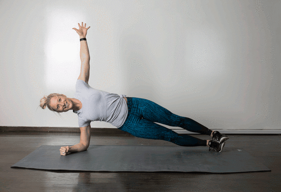 手肘支撑在垫面上 身体向右侧打开,伸直手臂 然后,还原,再向左侧打开 伸直手臂,左右重复练习5-8组 动作7: