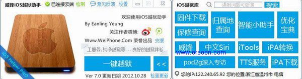iOS越狱助手另外一个特色就是云服务。越狱助手将所有核心越狱数据包和主程序放置云服务器,根据用户指令下载相应的数据到本地电脑,从而实现云端越狱。越狱助手的云服务最大的特色是可以获取最新的汉化和压缩的越狱工具,以及最新的iOS固件下载地址。可以说,有了iOS越狱助手,再也不用发愁上网找琳琅满目的帖子与下载地址了!