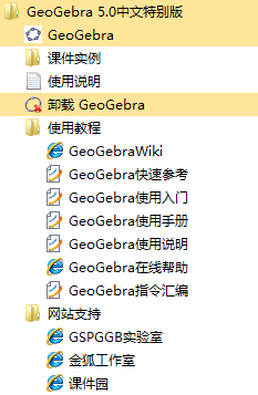 完全免费的类似几何画板的动态数学软件,支持数十种语言,支持多平台,获得多项国际性大奖。功能非常强大,比如在统计方面的应用和异常强大的中文命令是几何画板所不能的,以及无损网页输出和高清图片输出也是超越几何画板的,绝对是汇大数学教师不可多得的教学辅助软件。 2014.12.21 4.4/5.0程序更新 三个版本主要区别是: 5.0版:最新正式版,含3d功能,推荐的版本。 4.4版:去除了导出html格式功能,但增加了上传动态网页到GeoGebraTube服务器功能; 4.2版:经典稳定最终版本,可以导出html格式的动态网页型课件; 本版特色 1、整合五份中文使用教程,方便快速入门; 2、整合课件实例8类1006个,方便爱好者体验和参考; 3、重新打包制作,使软件更符合国人的使用习惯; 4、中文命令,免装Java,安装后即可使用。 论坛交流:http://www.gspggb.com GeoGebra★研究者:189722585 (实名制QQ群) 预览图(点击图片看大图): 开始菜单快捷方式,精彩从这里开始