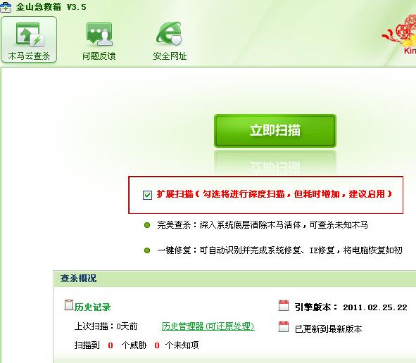 | 主页中了http://hao.kuaibo.com/或者www.726.com病毒删掉下载:金山急救箱3.5安装升级到最新版本,钩上深度扫描,查杀就可以去掉难缠的恶意病毒。 (2011-02-26) |