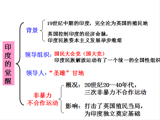 | 一、教学目标1.回顾所学知识,说出有关英国在印度建立殖民统治的情况,自学课文,叙述甘地早期非暴力思想及实践,举例说明甘地领导印度人民进行的非暴力不合.. (2011-02-27) |